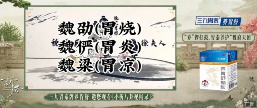 《折腰》热播期间,网友发现剧中魏家兄弟名字与“胃烧”“胃炎”相似,调侃魏府一家胃不好,喊话三九胃泰。三九胃泰迅速回应,上线超长剧情式广告,将“剧中人名”与“胃部不适表现”对应,让“魏府天团”成为胃部不适症状“专属代言人”。